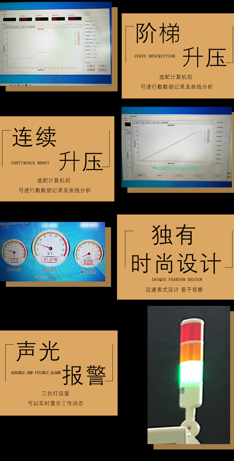 設備配有三色報警燈,綠燈亮時表示箱門關閉良好可以開始試驗,黃燈亮時表示試驗箱門打開,此時可進行試樣更換。紅燈亮時表示高壓大于0.5KV,此時不要開箱門。直流試驗結束放電過程警報燈會閃爍且報警。(總結:綠燈箱門關閉良好,黃燈開門小心操作,紅燈有高壓)